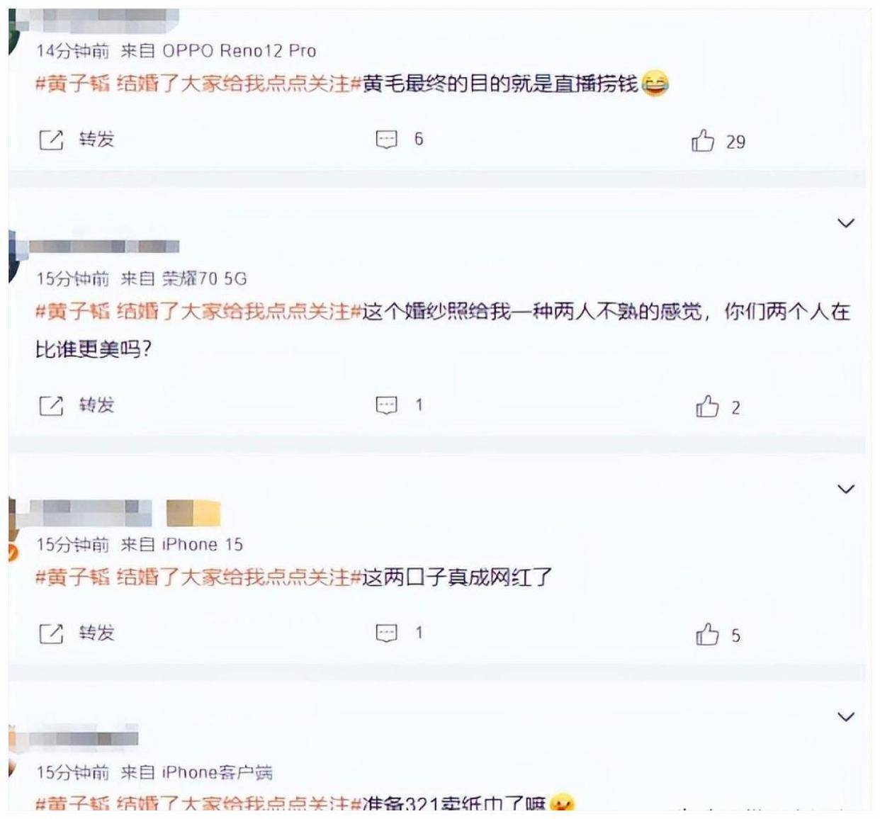 婚礼后两天 风波非但没平息,反而因为直播中出现了打赏功能而被人质疑“借婚礼带货”。这话传开后 不少人皱眉,觉得失了体面。可没过多久,另一个信息慢慢浮出水面:这场直播的所有打赏收入 都会捐给癌症患儿救助项目。这个细节像一瓢温水 慢慢浇熄了那些带着火气的指责。你想想,要是真为了赚钱,干嘛不直接挂链接卖货?可他们选择了一种更安静的方式,把关注度转化成了善意。黄子韬在直播里被问“会不会离婚”,他一脸认真回“一刻都没想过” 转头又补一句“你跟我老婆比?我当然觉得我老婆漂亮!”这话听着像综艺梗,可放在那个场景里 倒显得格外憨实可爱。